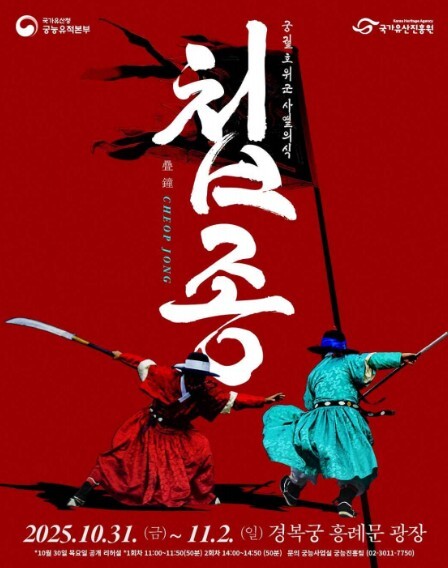 국가유산청 궁능유적본부는 국가유산진흥원과 함께 오는 31일부터 11월 2일까지 사흘간 경복궁 흥례문 광장에서 궁궐 호위군 사열의식 ‘첩종’을 개최한다고 23일 밝혔다. 행사는 하루 2회(오전 11시, 오후 2시) 열린다.