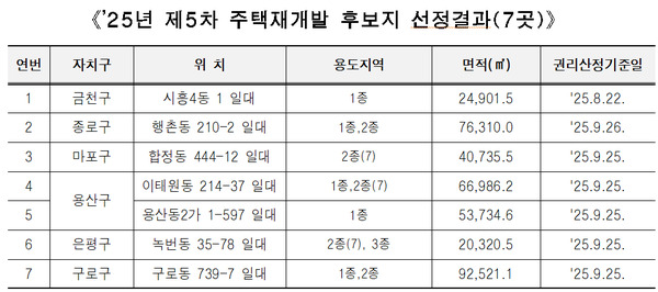 서울시가 3일 2025년 제5차 주택재개발 후보지 선정위원회를 개최해 7곳을 신속통합기획 후보지로 선정했다고 밝혔다. 신속통합기획 재개발 추진구역은 이번에 선정된 구역을 포함하여 총 136곳이 됐다.