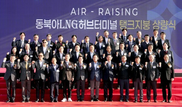 김영록 전라남도지사가 5일 여수 묘도 LNG허브터미널 현장에서 열린 ‘LNG탱크지붕 상량식’에서 주요 내빈, 참석자들과 기념촬영을 하고 있다.(2025.11.5)/전남도 제공