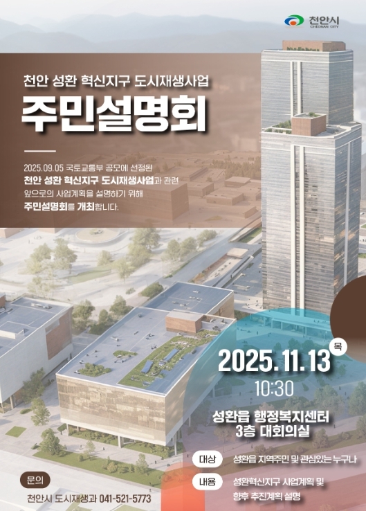 이경열 도시주택국장은 “성환 지역 활성화를 위해 오랜 기간 준비한 사업인 만큼, 주민과 소통하며 추진해 나갈 것”이라며 “많은 주민께서 설명회에 참석해 좋은 의견을 주시길 바란다”고 밝혔다.