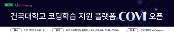 건국대학교는 올해 9월부터 국내 대학 중 처음으로 AI 코딩 학습 플랫폼 ‘COVI(Code Evidence)’를 자체 서버 기반 학습관리시스템(e-Campus)에 구축해 운영 중이라고 밝혔다.