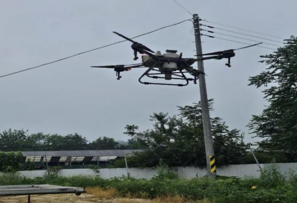 가을 수확기 야생멧돼지 농장 침입 위험이 높아짐에 따라 군은 민·관 협력 방식으로 드론을 투입해 농장 주변에 기피제를 집중 살포했으며, 접근이 어려운 임야 지역까지 방제 범위를 확대해 차단 효과를 극대화했다.