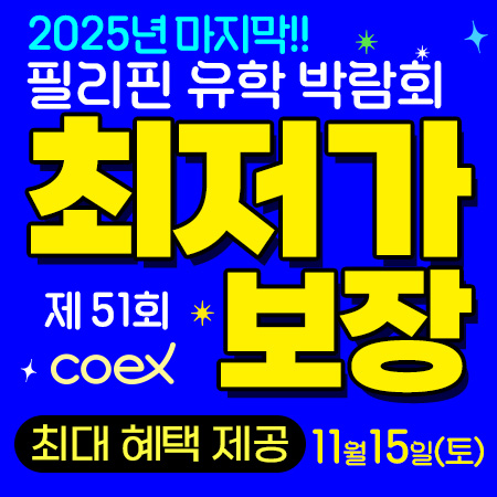 필리핀어학연수 필리핀주니어캠프 필리핀가족연수 ‘2025년 마지막 박람회’가 51회차로, 오는 15일(토) 코엑스 3층 컨퍼런스룸 327호에서 진행된다.