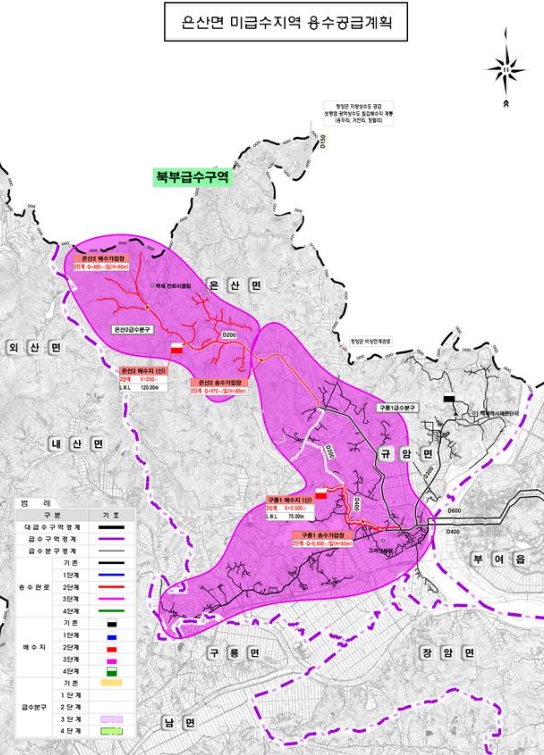 이번 사업에는 국비 등 총 490억 원의 사업비가 투입되며, 2026년부터 2031년까지 6년간 추진된다. 은산면 나령리 등 4개 마을에 상수관로 47km와 배수지 2개소 등을 신설해 안정적인 지방상수도를 공급하는 것이 핵심이다.