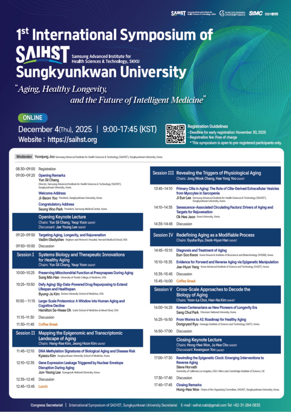 성균관대학교 삼성융합의과학원(SAIHST)은 오는 12월 4일 ‘Aging, Healthy Longevity, and the Future of Intelligent Medicine’ 제1회 국제심포지엄을 온라인으로 개최한다. 노화의 근본 기전부터 회춘 가능성, 빅데이터·후성유전학 기반 진단·치료 전략 등 지능형 의료 시대의 핵심 주제를 다룬다.