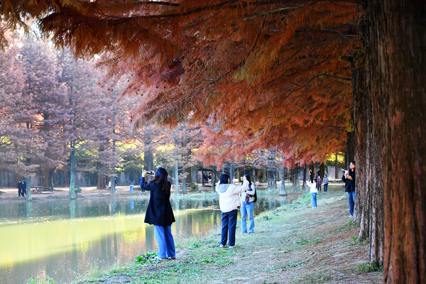 담양군 메타세쿼이아 가로수길이 가을 풍경의 절정에 달하면서 고요한 물 위에 반사된 숲의 색감까지 더해져 담양 특유의 늦가을 정취를 느끼려는 이들의 발걸음이 이어지고 있다.(2025.11.22)/담양군 제공