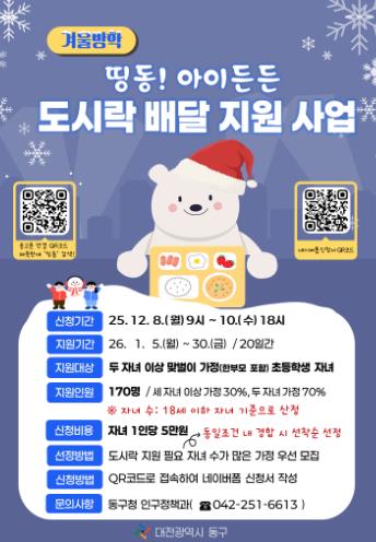동구는 초등학생 자녀를 둔 가정을 대상으로 ‘겨울방학 띵동! 아이든든 도시락 배달 지원사업’ 신청자를 모집한다고 24일 밝혔다.