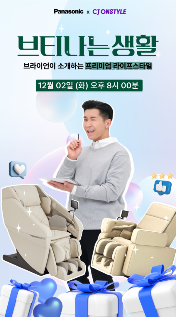 파나소닉 공식 총판사 (주)렙테크는 오는 12월 2일 ‘브라이언’이 파나소닉의 프리미엄 안마의자 EP-MAL1을 소개하는 '브티나는 생활' 모바일 라이브 방송을 CJ온스타일에서 진행한다고 밝혔다.