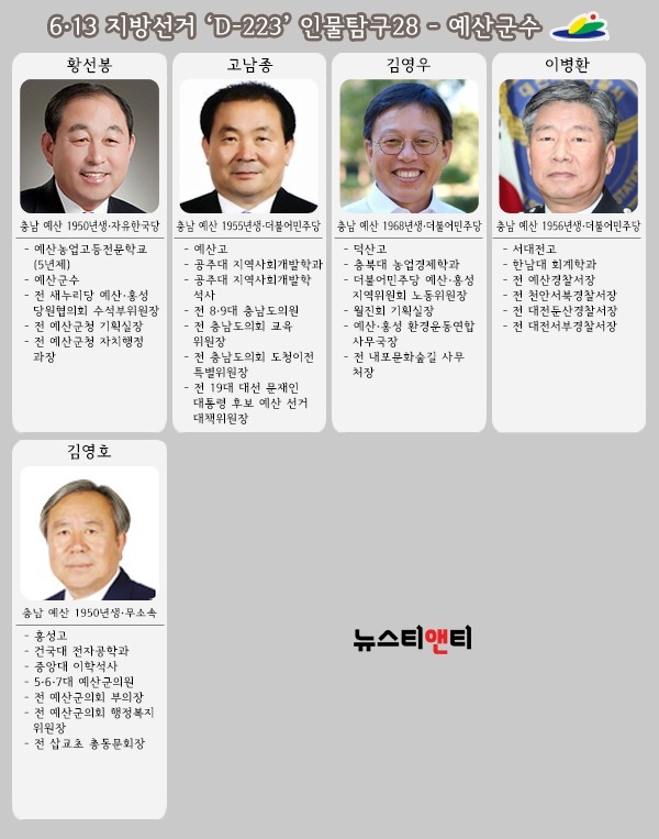 ▲ 출마 예상자들 = 내년 6.13 지방선거의 예산군수에 도전할 후보군은 모두 5명 정도로 확인됐다. 원내 7당 중에서 보수의 아성이라는 지역의 특성과 어울리지 않게 더불어민주당에 후보군이 몰려 있는 상황에서 보수 성향 무소속 후보도 출사표를 던져 3자 구도로 펼쳐질 전망이다. 특히 지난 2014년 지방선거에서 후보조차 배출하지 못했던 것과 비교하면 더불어민주당의 높은 지지율이 말해주듯 진보진영 후보군들의 출마 선언이 이어지고 있다.