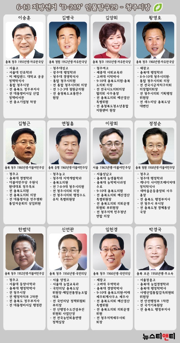 ▲ 출마 예상자들 = 내년 6.13 지방선거의 청주시장에 도전할 후보군은 모두 12명 정도로 확인됐다. 원내 1~3당에 골고루 후보가 분포되어 있는 청주시는 현역 시장이 낙마 위기에 몰리면서 출마자들이 더욱 늘어나는 형국이다.