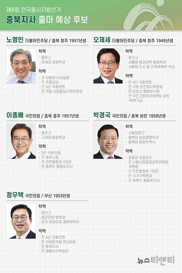 2022년 6.1 지방선거를 정확히 344일 앞두고 자천타천으로 충북지사에 거론되는 인사들은 5명 정도로 알려졌다. 충북은 충청권 4개 시·도 중 보수색이 가장 강한 지역이었으나, 지난 2010년 제5회 지방선거에서 7전 7승 ‘선거의 달인’ 이시종 충북지사가 당선된 이후부터는 정치지형이 변하면서 보수진영에서는 세 차례의 선거에서 도백을 차지하지 못하는 상황에 이르게 됐다.