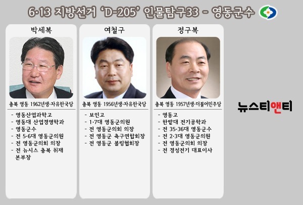 지방선거를 205일 앞두고 영동군수로 자천타천 거론되는 인물은 3명 정도로 알려졌다. 보은·옥천과 더불어 충북의 남부 3군으로 불리는 영동은 경북 김천과 경계를 이루는 지역적 특색 때문인지 보수색채가 짙다. 실제 영동은 1995년 제1회 민선 기초자치단체장 선거부터 지난 2014년 제6회 지방선거까지 보수진영과 진보진영에서 각각 네 차례와 두 차례의 군수를 배출했다. 특히 1995년 제1회 지방선거부터 2002년 제3회 지방선거까지는 진보진영에서 후보조차 배출하지 못했을 정도로 보수세가 절대적 강세를 보였다. 하지만 1973년 9대 총선부터 보은·옥천·영동 지역에서 내리 3선을 차지한 이용희 전 국회부의장이 진보진영의 척박한 토양을 개척한 이래 2004년 17대와 2008년 18대 총선에서 연거푸 당선되는 노익장을 과시하며 보은·옥천·영동의 남부 3군의 단체장까지 당선시키는 저력을 보였다. 그래서 2006년 제4회 지방선거에서 열린우리당 소속으로 당선된 정구복 후보는 이 전 부의장이 2008년 18대 총선을 앞두고 통합민주당 공천 탈락에 반발하며 자유선진당으로 당적을 옮기자 동반 탈당한 이후 2010년 제5회 지방선거 자유선진당 후보로 당선된 만큼 보수진영의 당선자라고 볼 수 없고, 진보진영의 당선자라고 볼 수 있다. 지난 2014년 제6회 지방선거에서는 보수진영 후보 2 對 진보진영 후보 1의 구도에서도 새누리당의 박세복 후보가 현역이었던 새정치민주연합의 정구복 후보를 1.14% 차이로 따돌리고 辛勝을 거두며 군수실에 입성했다. 지난 2016년 보은·옥천·영동·괴산 지역의 20대 총선에서도 새누리당 박덕흠 후보가 이용희 전 국회부의장의 아들인 더불어민주당 이재한 후보를 13.37% 차이로 여유 있게 따돌리고 재선에 성공했다. 지난 5.9 대선 역시 보수진영이 몰락한 상황에서도 자유한국당의 홍준표 후보가 문재인 대통령을 1.62% 차이로 따돌리고 1위를 차지하면서 보수진영이 강세를 이어갔다. 박근혜 전 대통령 탄핵 이후 원내 5당 체제가 형성되고 최근 원내 7당 체제로 바뀐 상황에서 남은 기간 어떤 변수들이 발생할지 알 수 없으나, 영동군수 선거의 주요 변수는 다음의 4가지 정도로 요약할 수 있다. 첫째는 권토중래를 꿈꾸며 3선에 도전하는 더불어민주당의 정구복 후보가 군정을 떠난 이후 어느 정도의 지지세를 결집할 수 있을지, 둘째는 문재인 대통령의 집권 초기 고공 행진을 이어가고 있는 더불어민주당의 지지율이 계속될지, 넷째는 북핵 위기로 인한 전쟁가능성이 더욱 심화될지, 다섯째는 문재인 대통령이 공약한 개헌 추진에 국민들이 얼마나 공감할지 등이다.