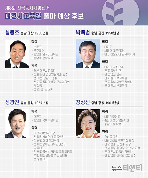 아직 출마에 관한 공식적인 언급은 없지만, 중도·보수진영 교육감들의 좌장으로 통하는 설동호 교육감은 3선 도전에 나설 것으로 전망되고 있다. 초·중·고 교사와 대학교수를 거쳐 두 차례 국립대 총장을 역임하는 등 전국 唯一無二(유일무이)의 화려한 경력을 갖추고 있는 설 교육감은 지난 2018년 6.13 지방선거에서 전교조 대전지부장 출신의 성광진 후보의 파상공세를 따돌리고 재선에 성공하며, 중도·보수진영 맏형으로서의 위치를 확고하게 점한 바 있다. 지난 2018 6.13 지방선거에서 공약한 공약 이행률을 점검하는 등 2학기 전면 등교에 대비하여 보폭을 확장하고 있는 설 교육감은 두 차례의 한밭대 총장을 지낸 경력과 현직 교육감으로서 높은 인지도를 바탕으로 특유의 친화력과 재임 중 대전교육을 반석 위에 올려놓은 업적을 통해 ‘일하는 교육감’으로서의 이미지를 확실하게 구축하고 있는 것으로 보인다. 특히, 높은 인지도를 비롯하여 탄탄한 조직력과 공주교대·한남대·충남대로 이어지는 학맥이 강점으로 꼽히고 있는 설 교육감은 충청권 유일의 중도·보수진영 교육감으로서 전교조 출신 교육감들에 맞서 세종·충남·충북을 아우르는 중도·보수진영 교육감 후보들의 반 전교조 연대의 선봉장으로 나설 것으로 보인다. 설 교육감은 기자와의 통화에서 “2학기 전면 등교를 앞두고 대전교육의 모든 역량을 결집해야 하는 중요한 시기라”면서 “지금은 이런 당면한 문제 해결과 안전한 교육 환경 속에서 학교의 일상 회복을 통한 대전교육 발전에 전념할 시점이라고 생각한다”는 입장을 피력하며 3선 도전에 대한 직접적인 언급은 피했다.