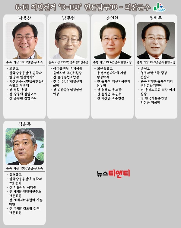 자유한국당에서는 송인헌 전 충북도 혁신도시관리본부장이 다시 한 번 도전할 의지를 내비치고 있다. 충북도 공보관과 음성군 부군수 등을 역임한 송 전 본부장은 지난 2014년 제6회 지방선거와 지난 5월 재선거에서 임각수 전 군수와 나용찬 군수에게 패배하며 군수실 입성의 꿈을 이루지 못했다. 꾸준히 지역 행사장에 얼굴을 내밀며 지지세를 결집하는 것으로 알려진 송 전 본부장은 기자와의 통화에서 “내년 지방선거에서 괴산군수에 출마할 계획이냐”는 질문에 “고민하고 있다”고 밝혀 출마 자체를 배제하지는 않았다. 임회무 도의원도 하마평에 오르내린다. 충북도의회 의장 비서실장과 한국자유총연맹 괴산군 지회장을 역임한 임 의원은 충북도의회 행정문화위원장도 맡고 있어 동료 의원들 간의 스킨십이 뛰어나다는 평가를 받고 있다. 당내에서도 활발하게 움직이고 있는 것으로 알려진 임 의원은 지난 5월 재선거에서 송인헌 전 충북도 혁신도시관리본부장에게 경선 문턱에서 패하며 본선 진출을 이루지 못했다. 바닥 민심을 파고들며 표밭을 갈고 있는 것으로 알려진 임 의원은 괴산을 새롭게 설계할 비전 마련에 열심인 것으로 확인됐다.