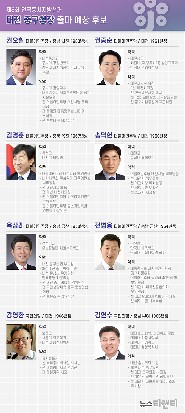 2022년 6.1 지방선거를 정확히 288일 앞두고 대전 중구청장 후보로 자천타천으로 거론되는 인사들은 8명 정도로 알려졌다.