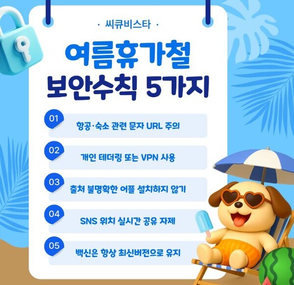 전덕조 씨큐비스타 대표는 “요즘 피싱은 실제 항공사나 리조트 예약 메시지처럼 정교해 한눈팔면 속기 쉽다”며 “여행 준비 점검 리스트에 ‘휴가철 5대 보안 수칙’을 포함해 보안을 생활 습관으로 정착시키길 바란다”고 전했다.
